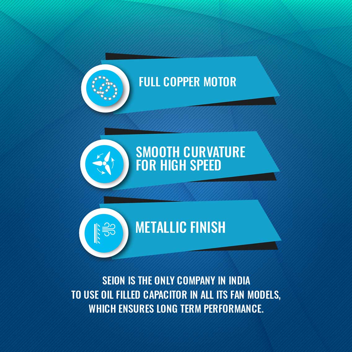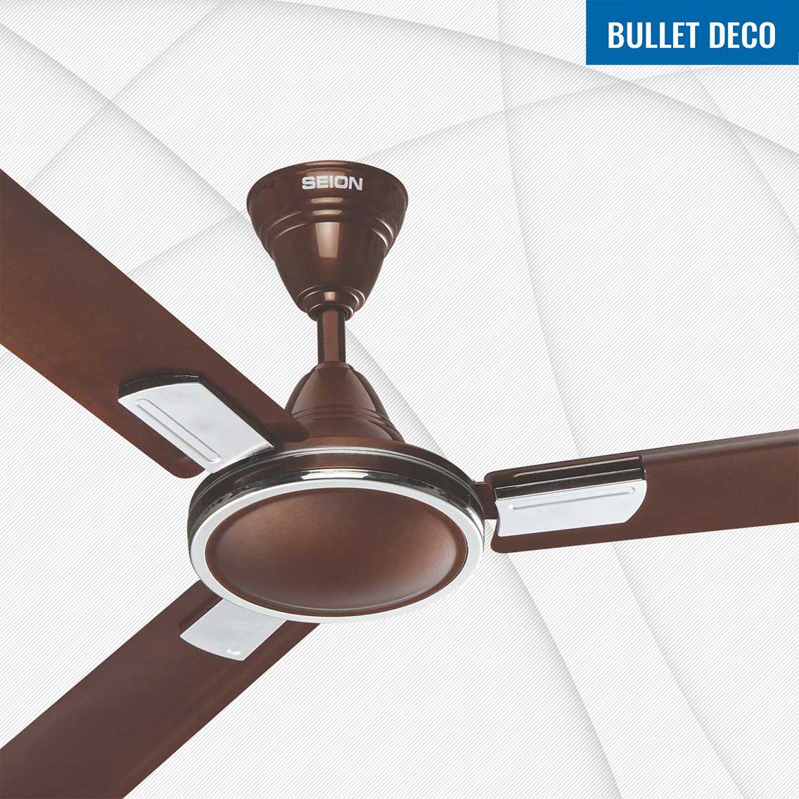 The Seion Bullet Deco is a true amalgamation of style and power. Its smooth curvature provides high speed and optimum air delivery of 400 RPM. The combination of technological ingenuity with aesthetic metallic finish, provides an effective cooling solution while making it the perfect fit to your modern abode and urban lifestyle.