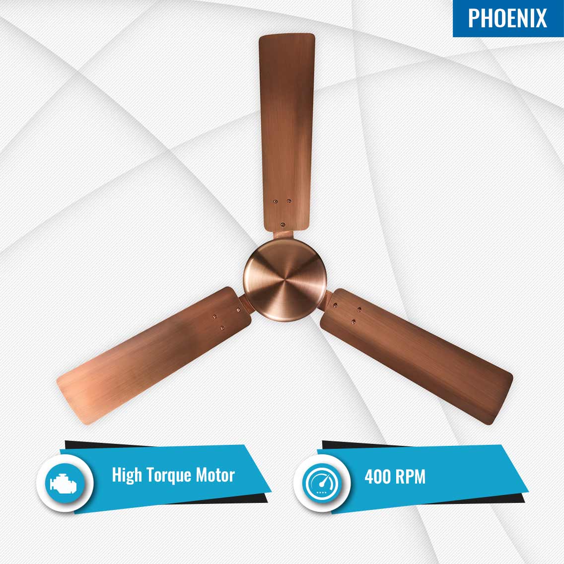 Phoenix Ceiling Fan comes with an electroplated finish and is equipped with a High Torque Motor that operates at 400 RPM.